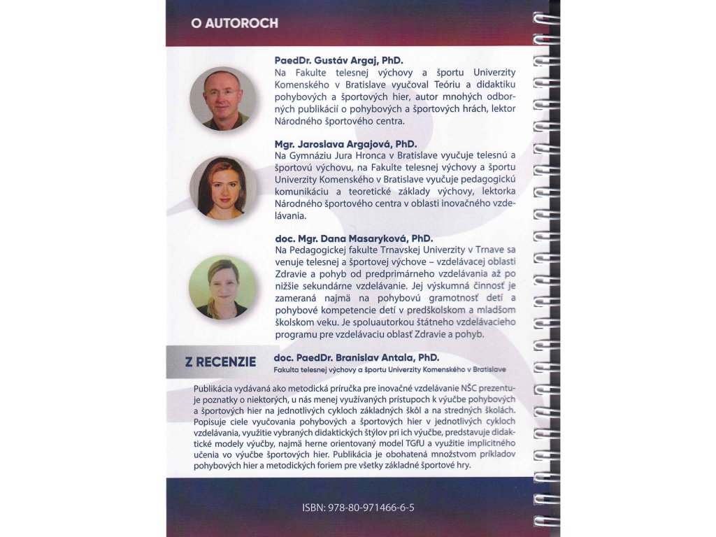 Praktická metodická príručka v hrebeňovej väzbe pre učiteľov telesnej výchovy a trénerov. Kniha prináša moderné pohľady na vyučovanie pohybových a športových hier. Autori (G. Argaj, J. Argajová a D. Masaryková) spájajú dlhoročné skúsenosti z akademického prostredia a praxe na školách.