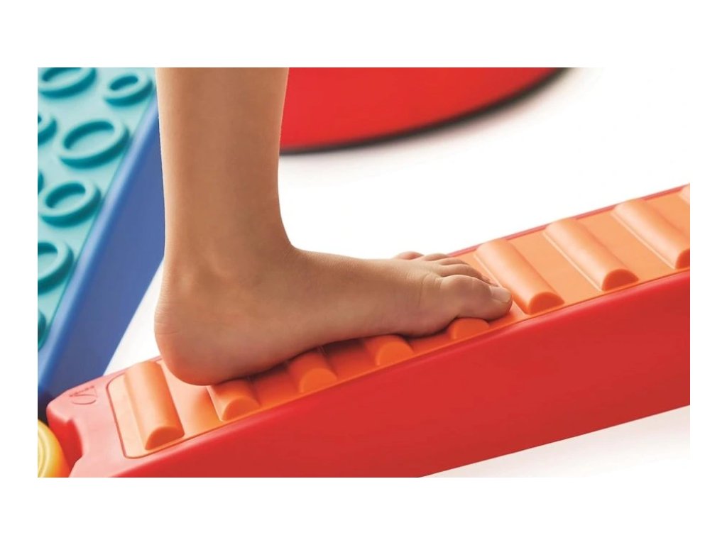 Sada obsahuje šesť hmatových lávok, ktoré sa pripájajú na tri červené a tri žlté pylóny. Každá lávka má unikátny hmatový povrch, ktorý stimuluje zmysly dieťaťa, najmä pri používaní naboso. Vďaka kombinovaniu rôznych výšok a smerov môžu deti stavať rovné úseky, dráhy so sklonom aj balančné „kopce“.