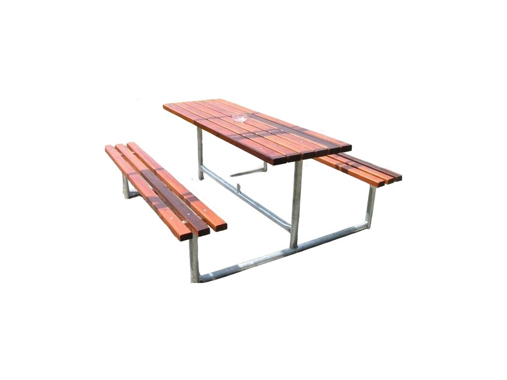 Záhradný set obsahuje dve lavice bez operadla a jeden stôl. Je navrhnutý pre vonkajšie použitie v prostredí s vysokou záťažou – ideálny pre reštauračné terasy, parky, športoviská či školské areály. Kombinuje robustnú oceľovú konštrukciu s kvalitnými drevenými prvkami ošetrenými lazúrovým náterom pre maximálnu odolnosť voči poveternostným vplyvom.